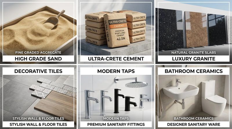 We use only high-grade materials including sand, aggregates, cement, granite, tiles, and sanitary fittings.